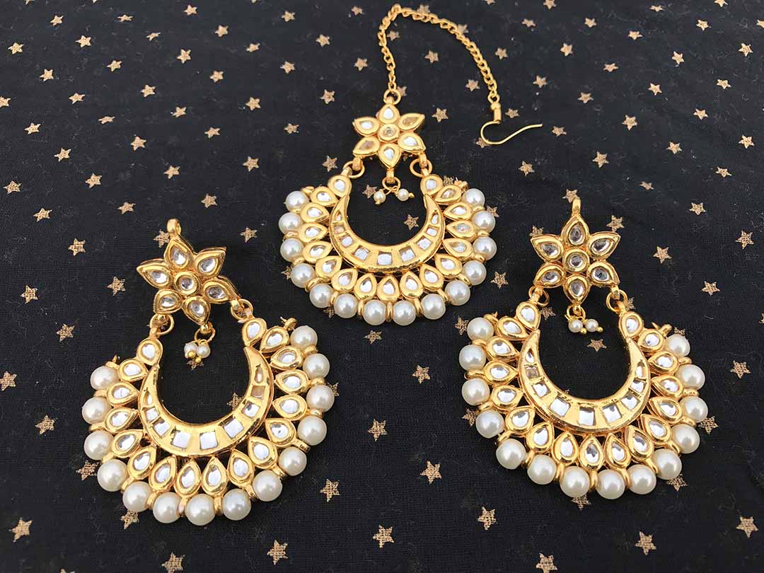 Kundan Chaandbaali Earrings & Maangtikka with Fine White Pearls