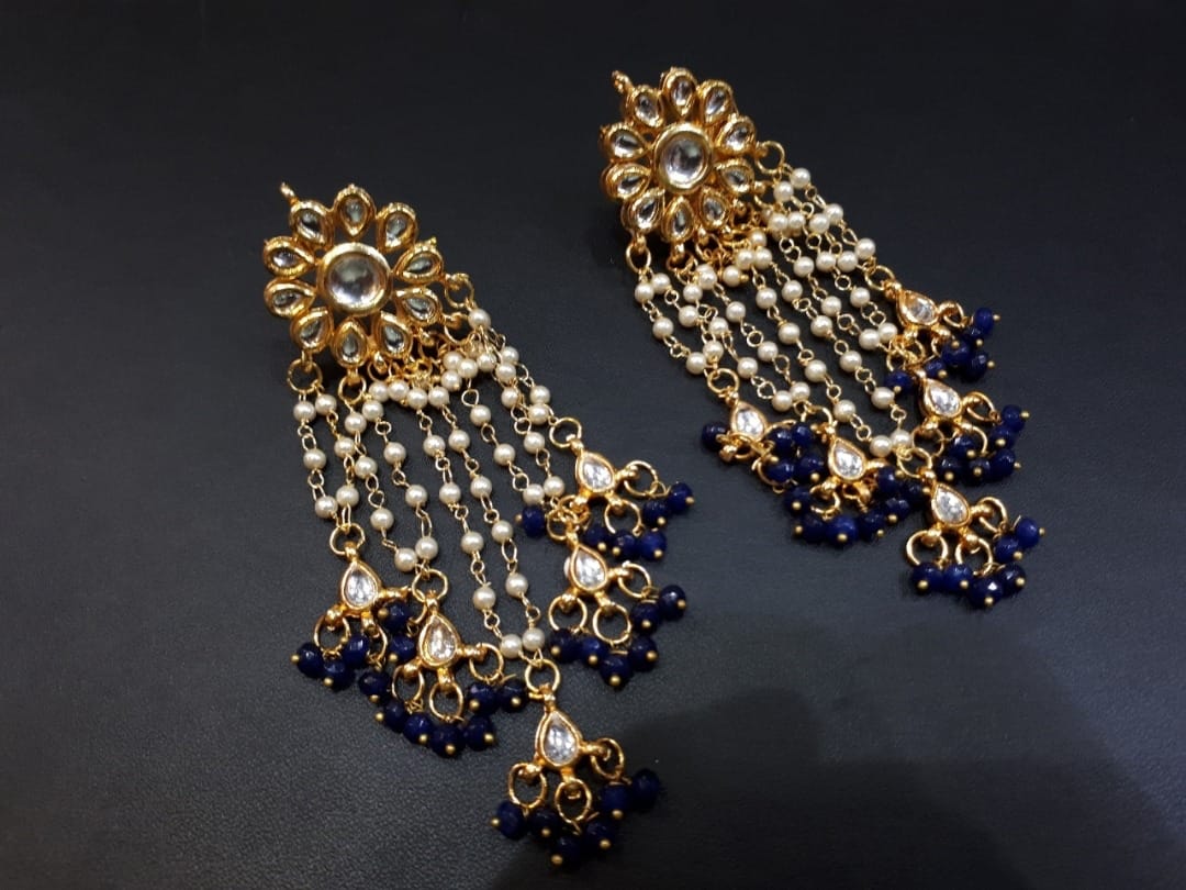 Flower Top Kundan with Kundan Latkan and Blue Beads Earrings